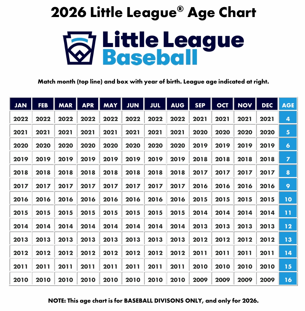 Little League International establishes the League Age rules. To confirm your player's league age for the Spring 2026 season use Little League's League Age Calculator or use the League age chart below.